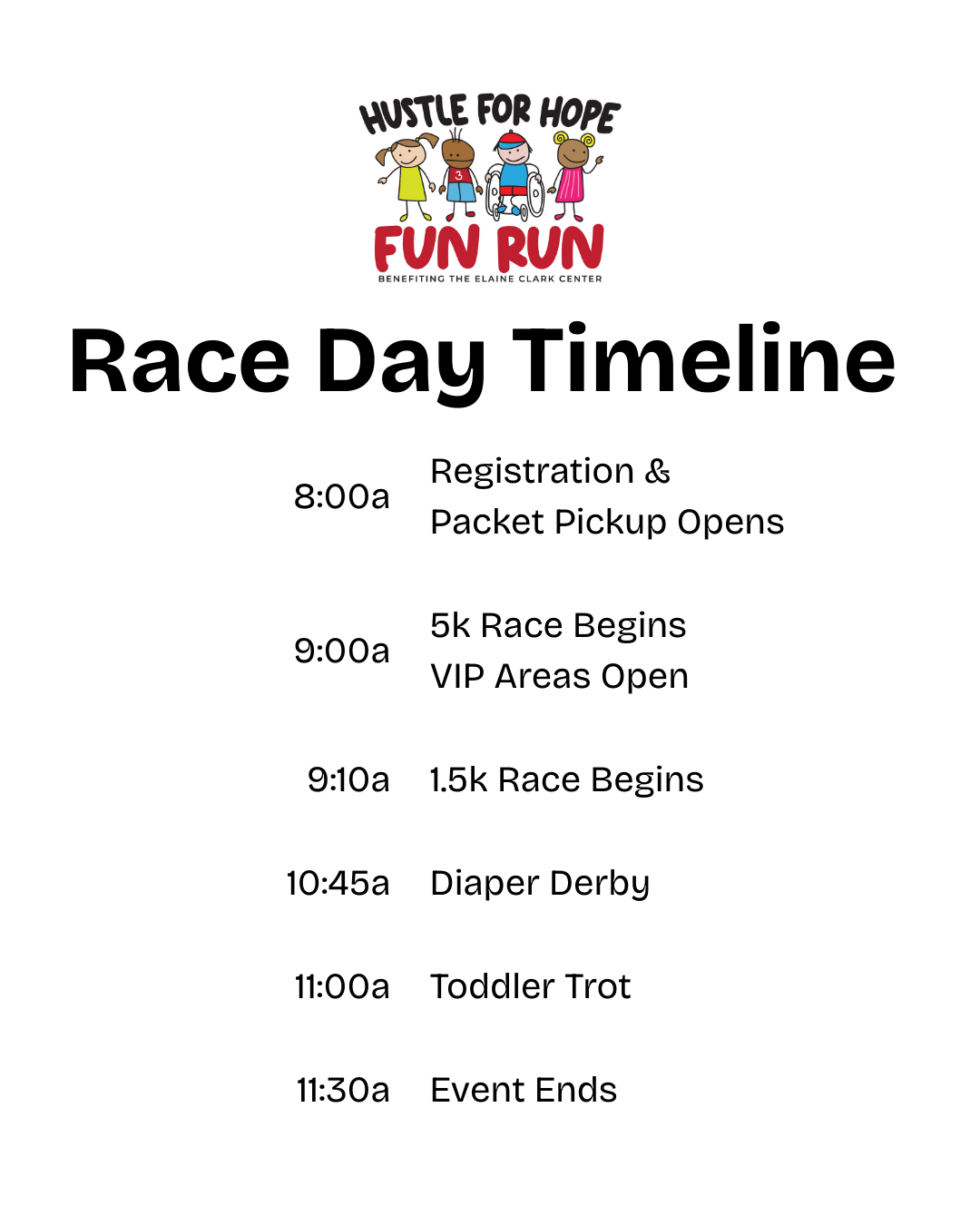 - Post-Race Celebration with games, a Diaper Derby, and Tot Trot.